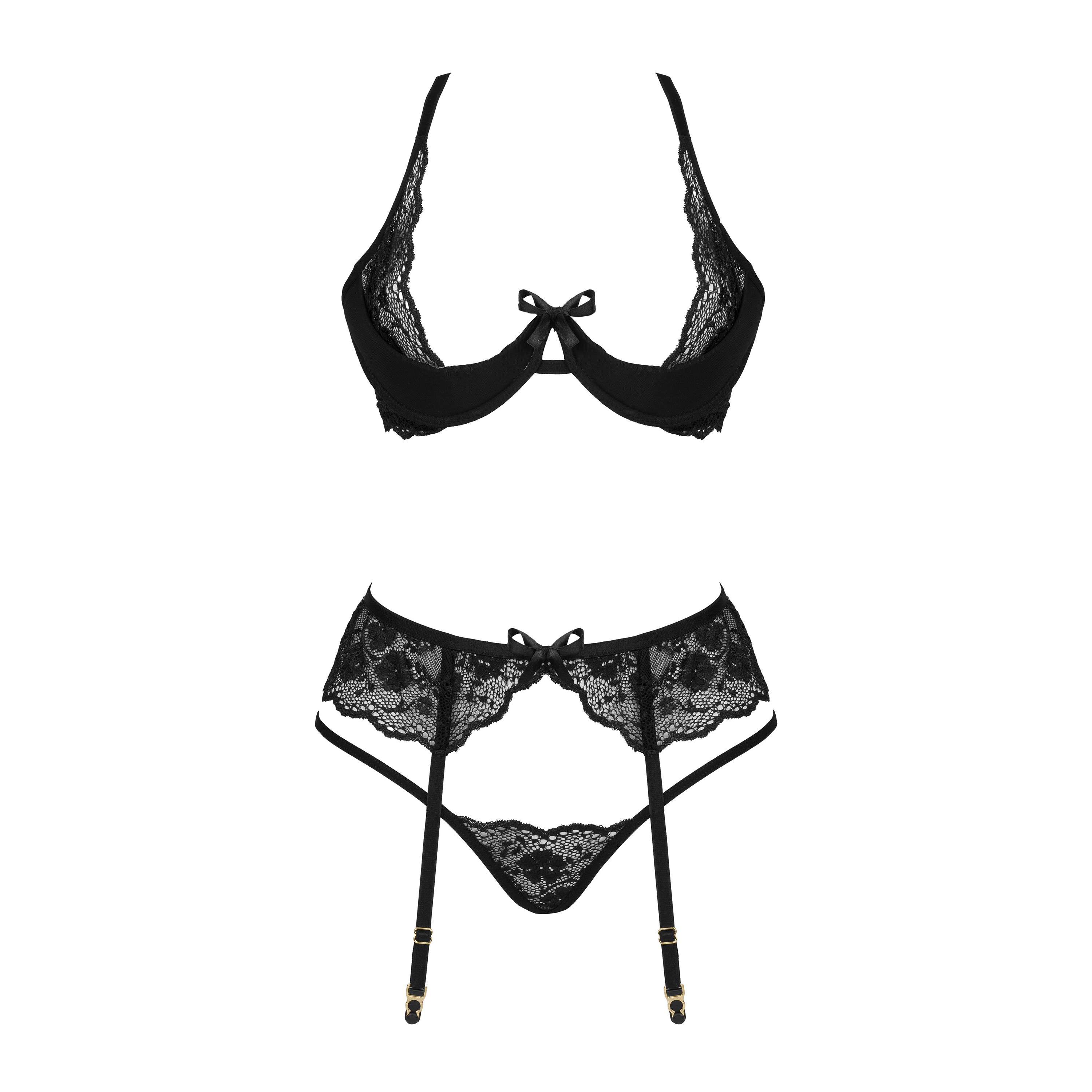 - Lingerie de 3 Peças: Sutiã, tanga e cinto de ligas.