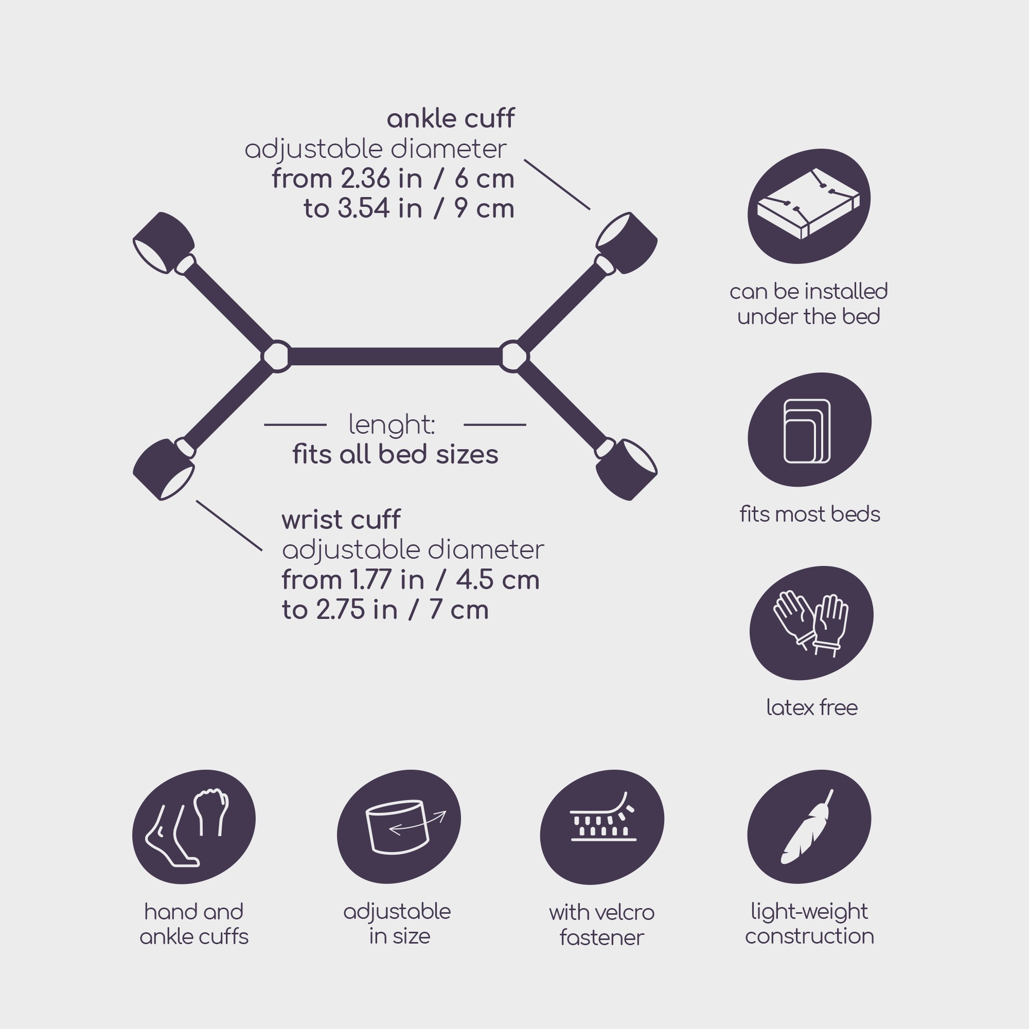 - Uso: Jogos BDSM, bondage, dominação e submissão, restrição de movimentos na cama