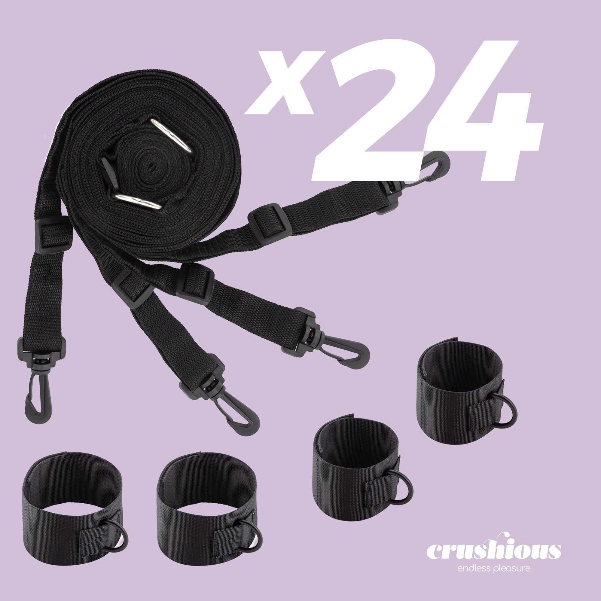 Este pack contém 24 conjuntos de restrições de cama bondage Crushious, ideal para lojas de produtos eróticos, sex shops, e para quem quer comprar em quantidade para revenda.
