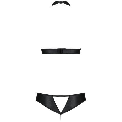 Descubra a ousadia e a elegância deste conjunto de lingerie da Passion, que combina couro ecológico com um design de top preso no pescoço e tanga aberta para uma experiência de sedução inesquecível.