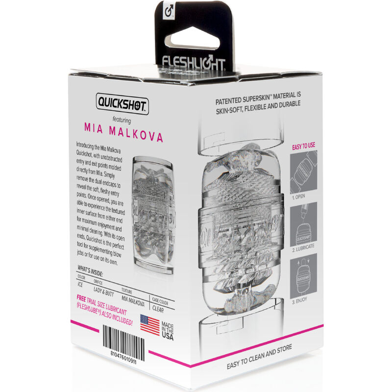 Mia Malkova Quickshot es un masturbador con orificios de salida sin obstrucciones, moldeados con la forma de la vagina y el ano de Mia. Este masturbador puede usarse para una estimulación adicional durante el sexo oral en pareja o para la masturbación individual. Con el Mia Malkova Quickshot™ de Fleshlight®, transparente y compacto, podrás disfrutar de cada momento de placer gracias a su carcasa transparente.
