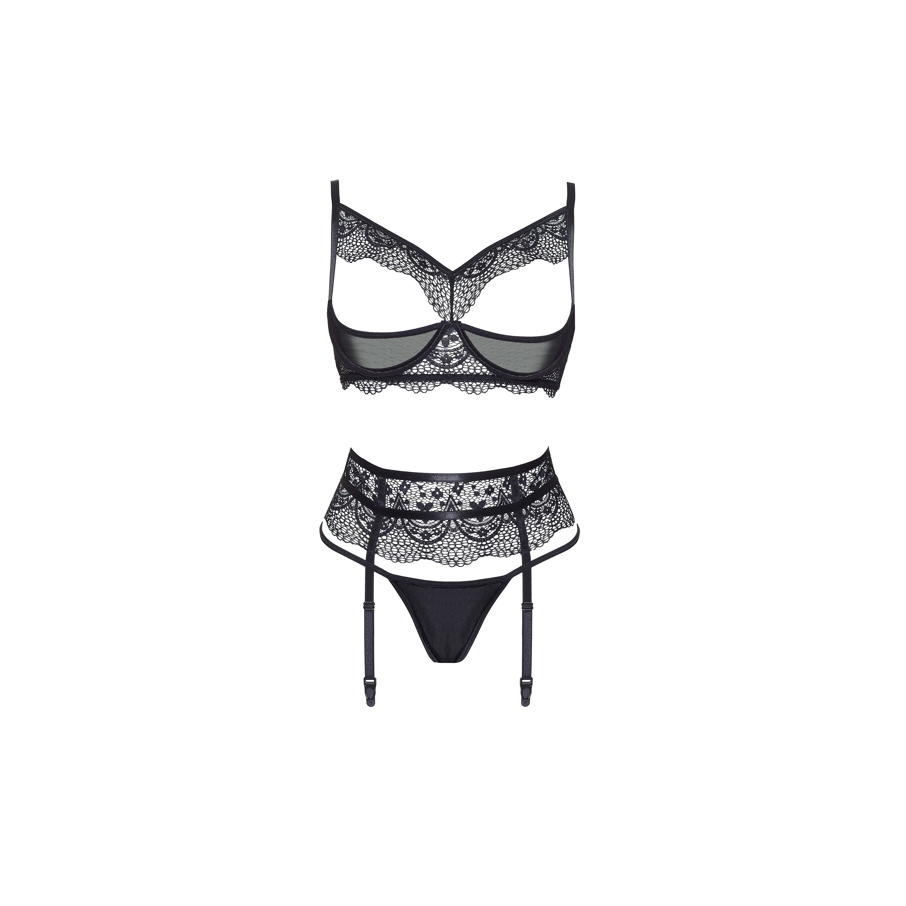 ENSEMBLE 3 PIÈCES CHIARA BLACK BEAUTY NIGHT FASHION : Lingerie sensuelle avec soutien-gorge à bonnets ouverts et porte-jarretelles.