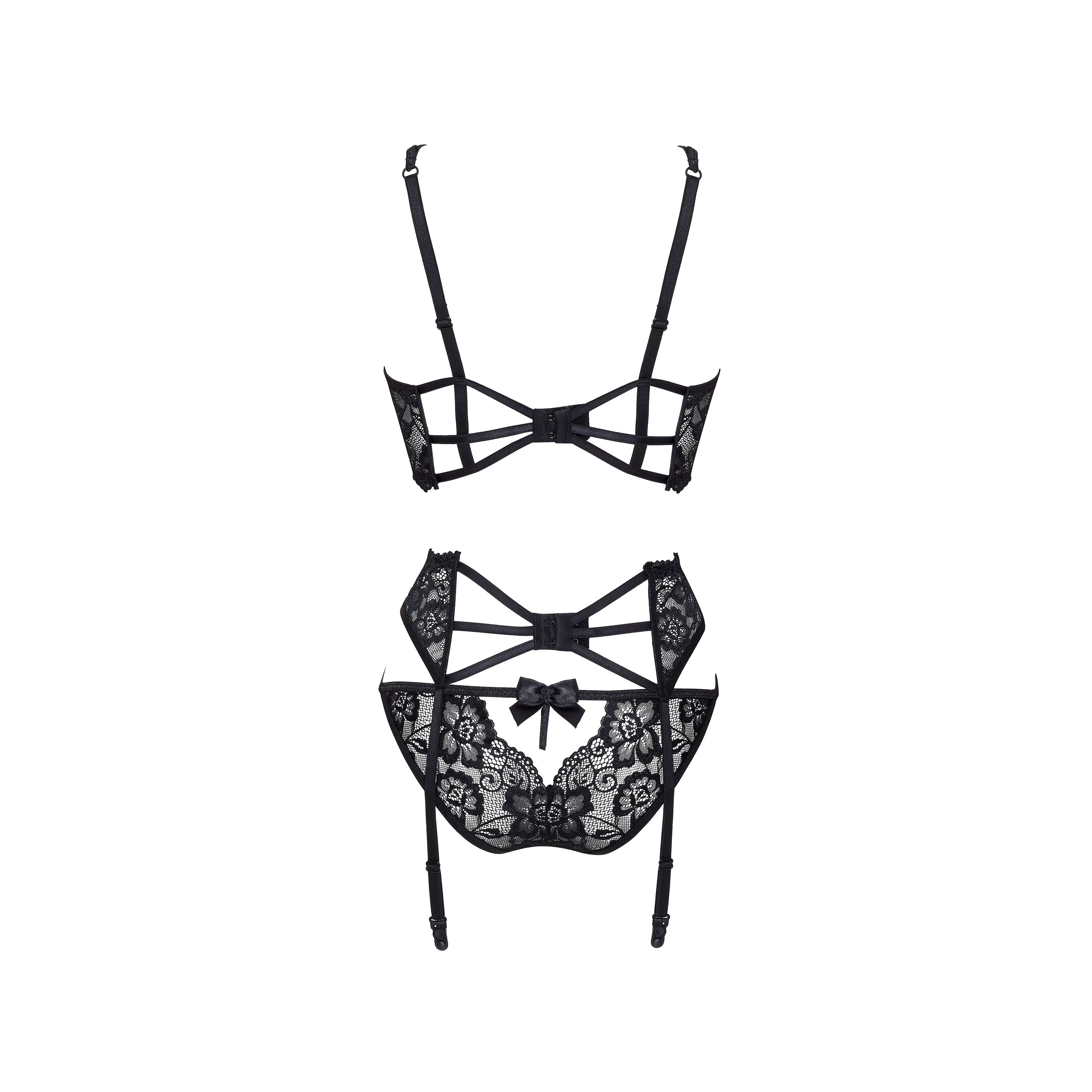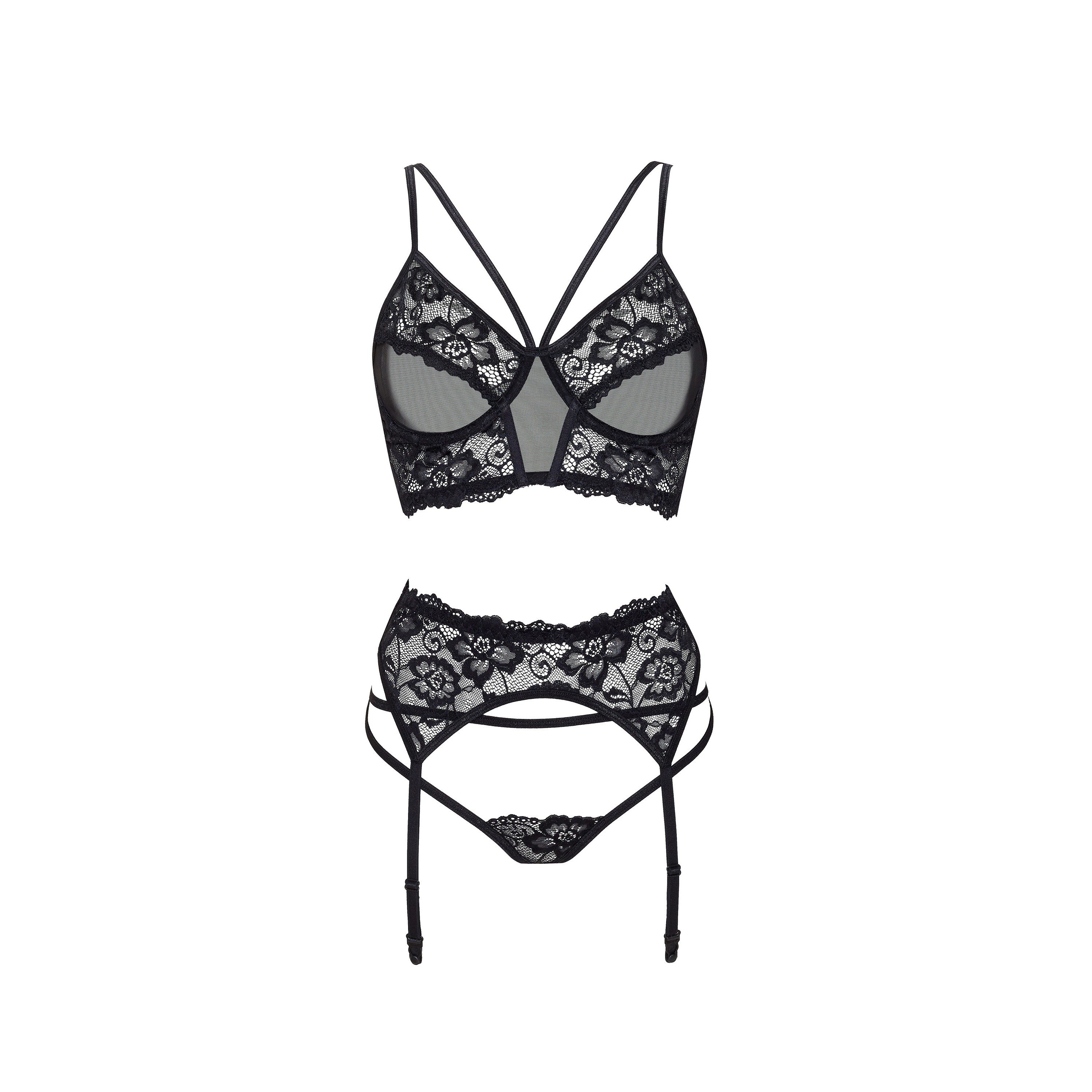 Conjunto de três peças (sutiã, cinto de ligas e cuecas) em renda delicada, pensado para realçar a silhueta com acabamento sofisticado e detalhes decorativos.