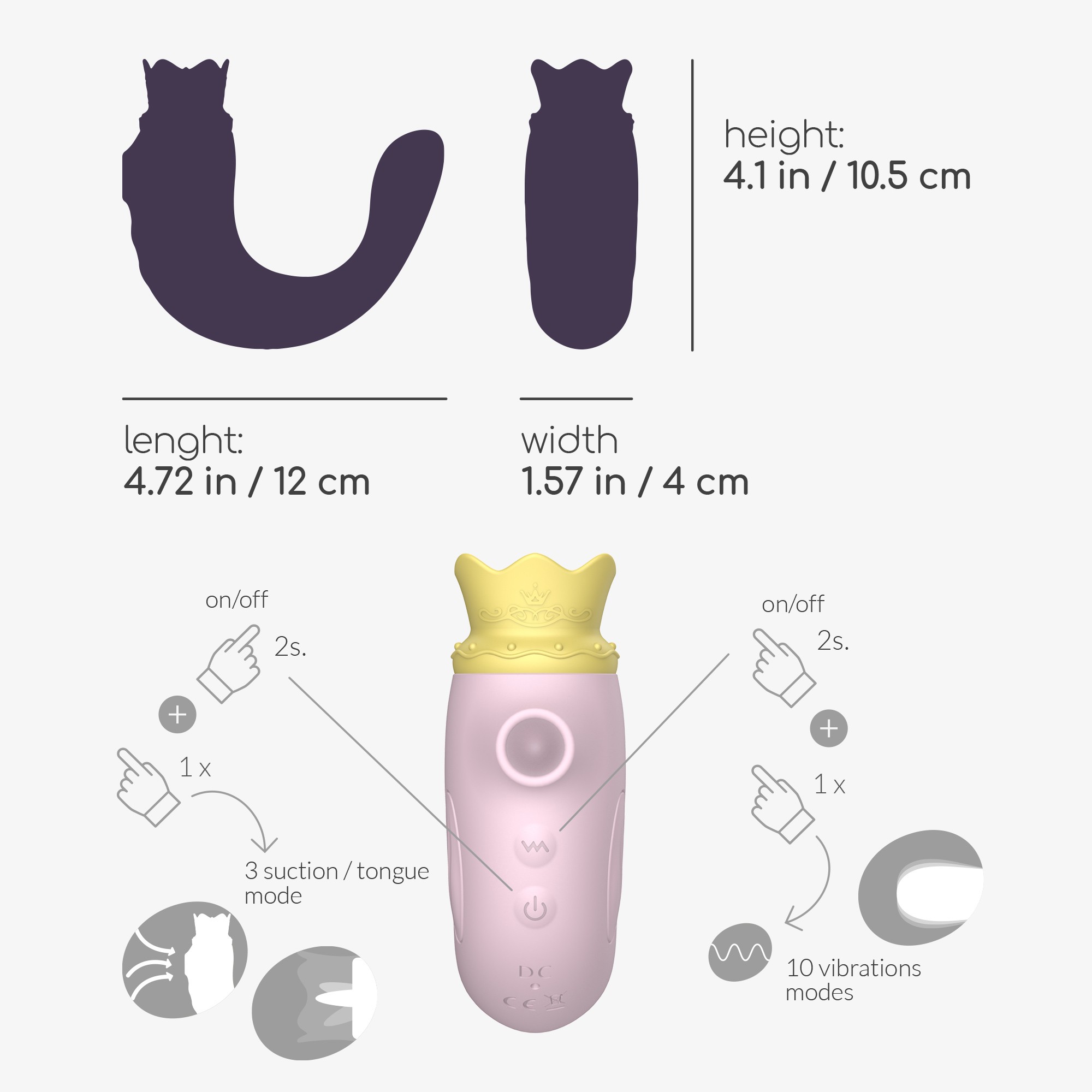 - Allumez l'appareil et familiarisez-vous avec les commandes : parcourez les 3 modes de succion/langue (sur la tête) et les 10 modes de vibration (sur la queue).