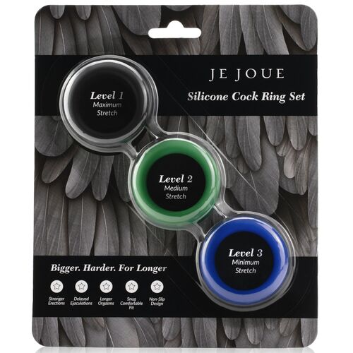 Conjunto de anéis penianos JE JOUE em silicone de alta qualidade, com três peças de estiramento progressivo para experimentar diferentes níveis de pressão e combinações. Cada anel apresenta uma textura macia e sedosa que favorece o conforto durante o uso e pode ser colocado ao redor do pénis, dos testículos ou em ambos.
